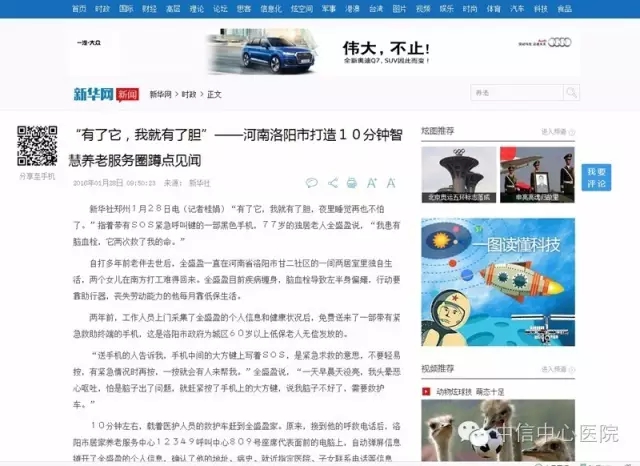 今年,1月28日,新華社播發(fā)通訊《有了它,我就有了膽》,并同步播發(fā)一組圖片,報(bào)道我院與洛陽市居家養(yǎng)老服務(wù)中心聯(lián)合搶救澗西區(qū)全盛盈老人的事兒。同時對我市著力推動養(yǎng)老服務(wù)理念、方式、技能創(chuàng)新,打造10分鐘智慧養(yǎng)老服務(wù)圈,形成“互聯(lián)網(wǎng)+照護(hù)服務(wù)”“互聯(lián)網(wǎng)+移動醫(yī)療”“互聯(lián)網(wǎng)+老年金融”等特色智慧養(yǎng)老服務(wù)的做法進(jìn)行了報(bào)道!吨袊W(wǎng).新聞中心》、《環(huán)球網(wǎng)》、《貴陽網(wǎng)》、《洛陽日報(bào)》、《洛陽晚報(bào)》等十余家國內(nèi)主流媒體進(jìn)行了轉(zhuǎn)發(fā),其中《洛陽日報(bào)》在1月29日頭版位置進(jìn)行了全文刊發(fā),全文如下: