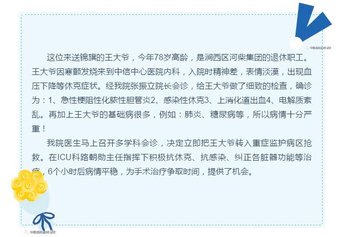 王大爺?shù)睦习榉Q,王大爺有膽結(jié)石多年,因為年老體弱始終下定不了決心手術(shù),一直吃中藥調(diào)理。大難之中,病被及時治愈,家里的親人都十分感謝中信中心醫(yī)院參與搶救所有醫(yī)生和護士們。普外科護士長李美菊聽到這番感謝之詞時十分感動,李護士長說道:“這本來就是我們醫(yī)生護士的分內(nèi)之事,沒想到王大爺老夫婦一直惦記著我們醫(yī)院。希望所有的醫(yī)患關系都能這么和睦,我們盡心盡力為病患診治,病人也真心理解我們!