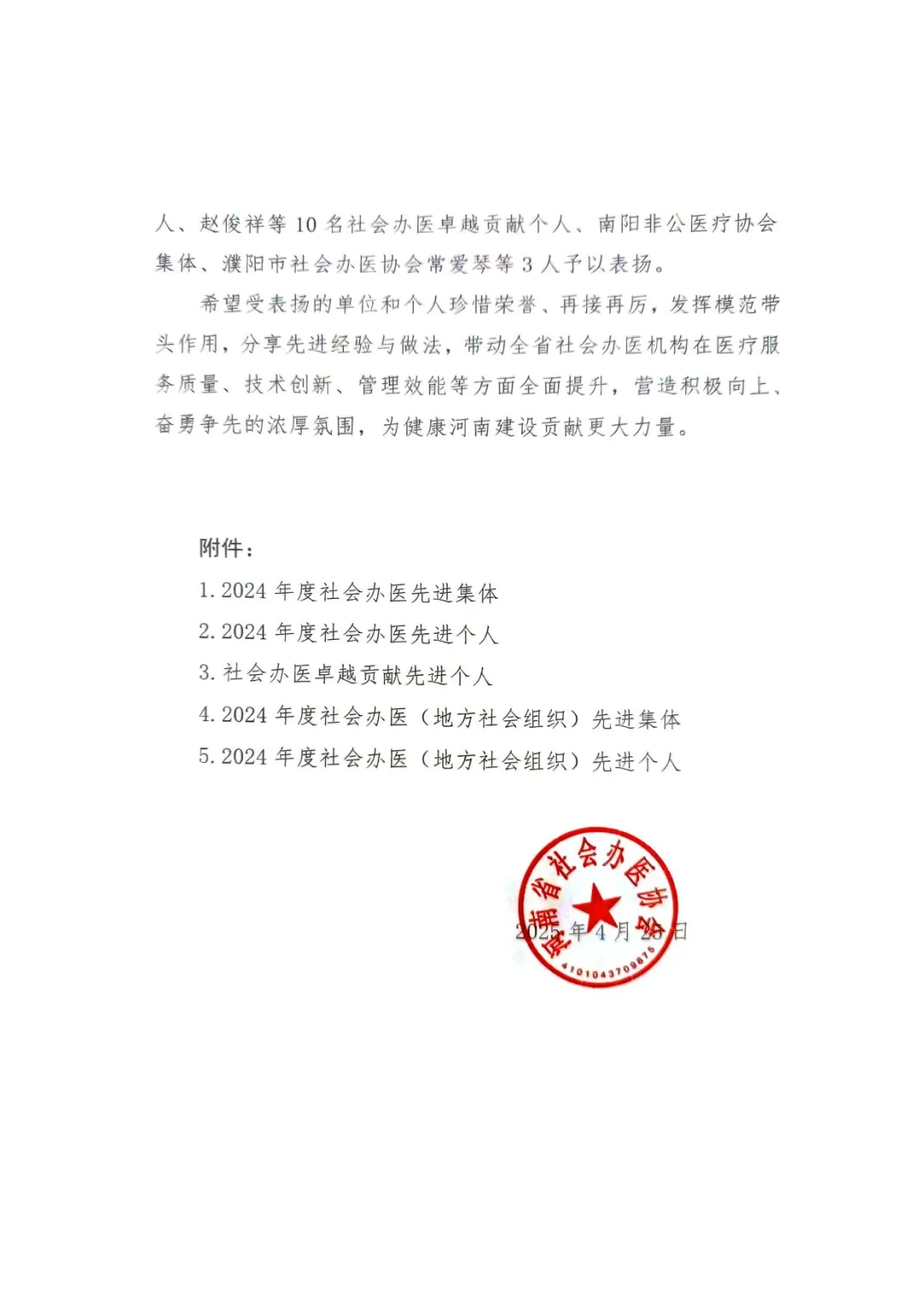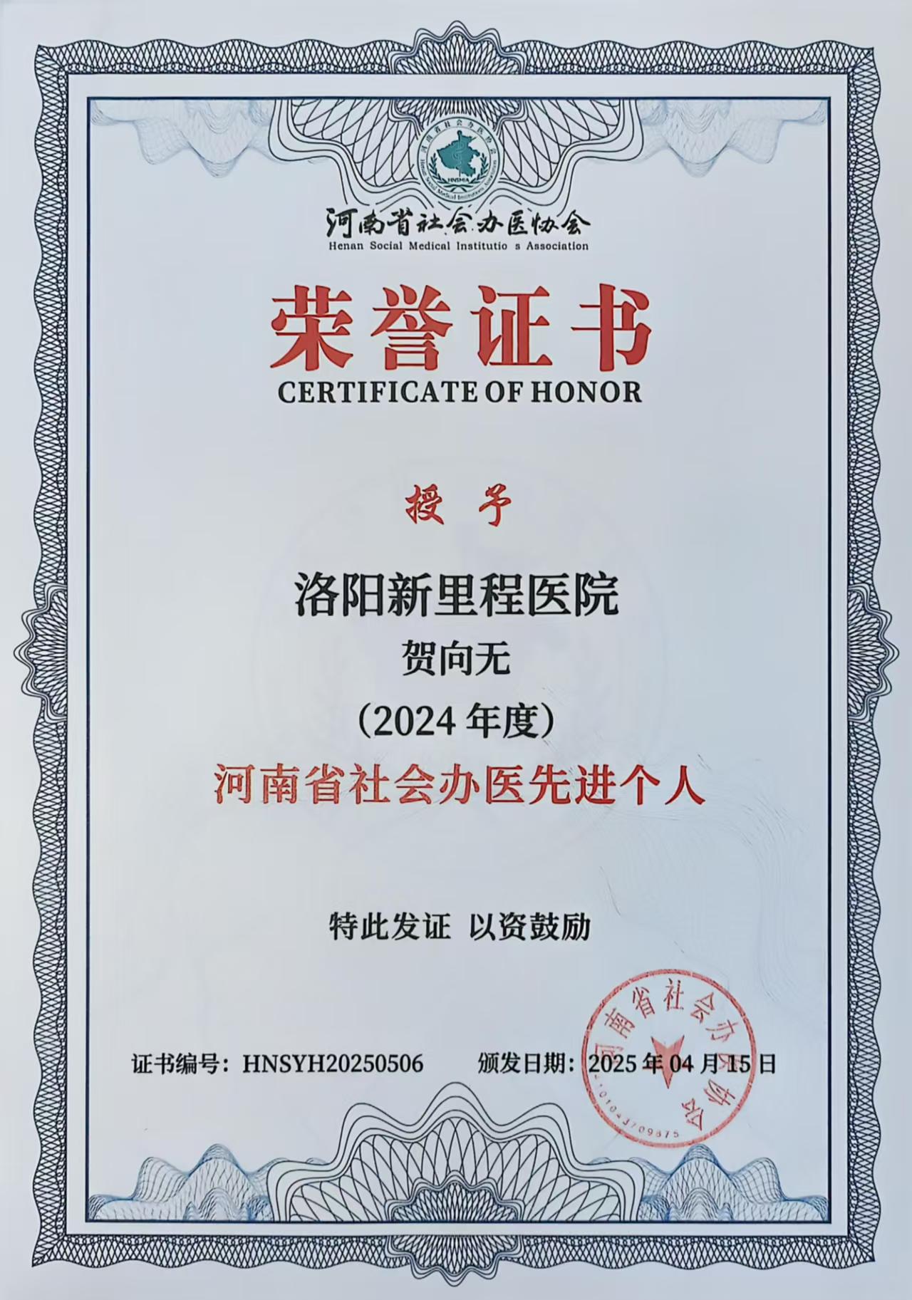在河南省社會辦醫(yī)協(xié)會組織的2024年度社會辦醫(yī)工作先進集體和先進個人評選中,我院以扎實的工作成效和積極的行業(yè)貢獻,被授予“先進集體”榮譽稱號;院長賀向無榮膺“先進個人”稱號。